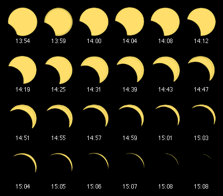 The progression of the eclipse, at the somewhat irregular intervals when I felt like taking each picture.